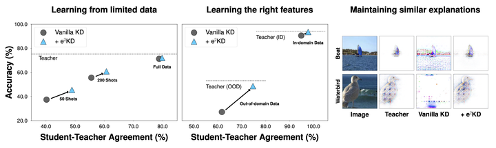 Knowledge Distillation (KD) has proven effective for compressing large teacher models into smaller student models. While it is well known that student models can achieve similar accuracies as the teachers, it has also been shown that they nonetheless often do not learn the same function. It is, however, often highly desirable that the student’s and teacher’s functions share similar properties such as basing the prediction on the same input features, as this ensures that students learn the ‘right features’ from the teachers. In this work, we explore whether this can be achieved by not only optimizing the classic KD loss but also the similarity of the explanations generated by the teacher and the student. Despite the idea being simple and intuitive, we find that our proposed ’explanation-enhanced’ KD (e2KD) (1) consistently provides large gains in terms of accuracy and student-teacher agreement, (2) ensures that the student learns from the teacher to be right for the right reasons and to give similar explanations, and (3) is robust with respect to the model architectures, the amount of training data, and even works with ‘approximate’, pre-computed explanations.